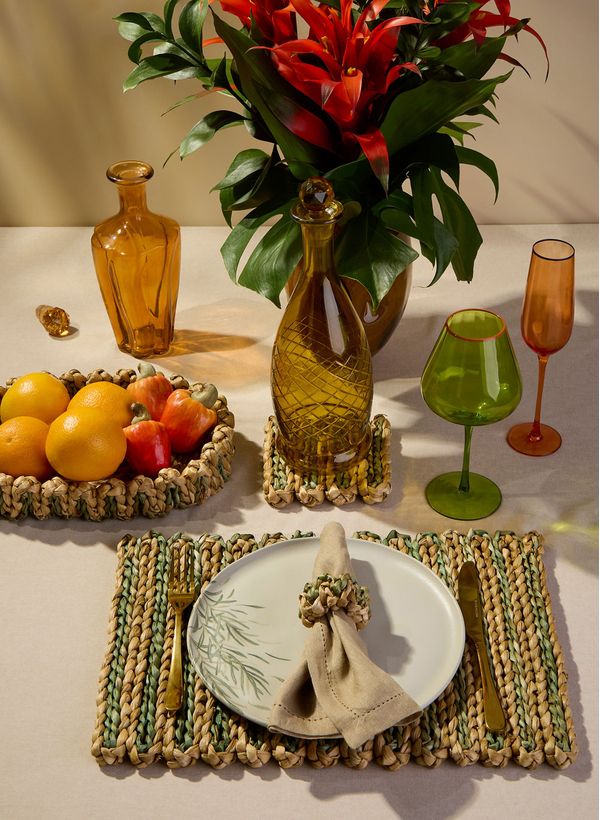 O Anel De Guardanapo Maré é produzido artesanalmente em fibra natural. Possui formato cilíndrico e superfície tramada em tons de verde e tons naturais - da própria fibra. Devido ao processo manual, podem ocorrer pequenas variações de cores, tamanhos, formas e padronagens entre as peças, tornando assim cada peça única.