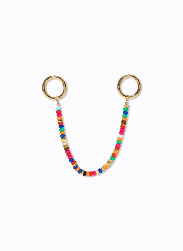Produzido em metal, o Bag Charm possui dois argolas em banho dourado ligadas por corrente de miçangas coloridas em formato arredondado, com detalhes de contas metálicas intercaladas, acabamento polido e fecho de encaixe seguro nas extremidades.