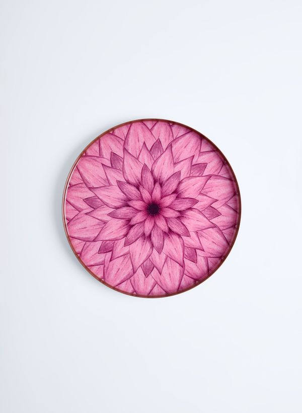 A Bandeja Redonda Índia une expressão artística e funcionalidade com elegância. Produzida em ferro com acabamento resinado de alto brilho, destaca-se pela estampa floral simétrica em tons de rosa e bordô, inspirada nas mandalas indianas. A borda metálica dourada emoldura a peça, conferindo sofisticação e delicadeza à composição.