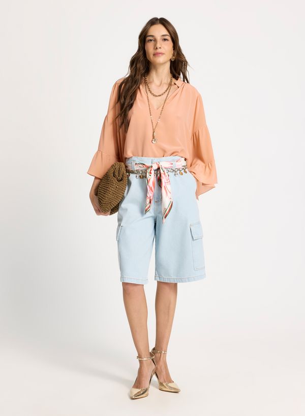 Confeccionada em algodão, a Bermuda possui modelagem clochard com comprimento abaixo do joelho, cintura alta com cós largo, passantes e faixa do mesmo tecido para amarração, bolsos utilitários frontais com lapela, recortes pespontados em contraste, barra ampla e acabamento pespontado.