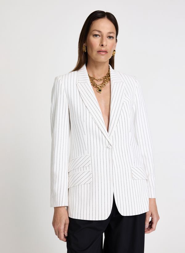 Confeccionado em tecido plano, o Blazer possui modelagem de alfaiataria apresenta lapela clássica, fechamento frontal por botão único, bolsos frontais com lapela e bolso superior decorativo, mangas longas com acabamento refinado e o forro interno garantem praticidade e um vestir impecável, enquanto as listras verticais alongam visualmente a silhueta.