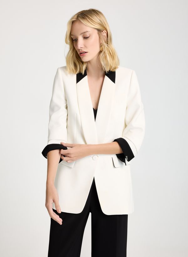 Confeccionado em tecido plano, o Blazer possui modelagem levemente alongada, corte de alfaiataria com gola em contraste, ombros estruturados, mangas longas e bolsos frontais com lapelas aplicadas e detalhe de viés, fechamento frontal por botão único e acabamento de barra levemente arredondada.