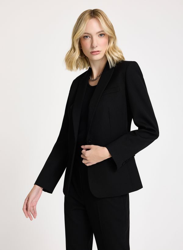 Confeccionado em tecido plano, oBlazer possui modelagem e corte em alfaiataria, caimento reto, lapelas peaked, bolso frontal embutido e lapelas aplicadas, mangas longas, fechamento frontal por botão e forro embutido.