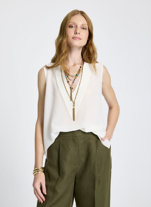A Blusa é confeccionada em seda, possui caimento reto, decote em "V" com franzidos posterior, alças largas, cava com detalhe reto, mini fendas nas laterais e acabamento pespontado.