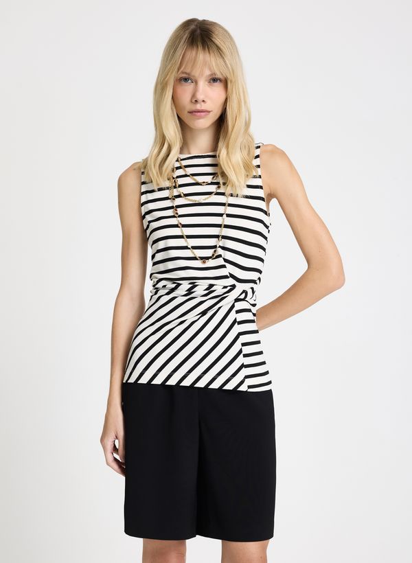 Confeccionada em tecido plano com elasticidade, a Blusa possui modelagem ajustada ao corpo, decote arredondado com acabamento limpo, cavas sem mangas com estrutura reta, estampa listrada em contraste que valoriza a silhueta, detalhe frontal com torção localizada que cria efeito drapeado assimétrico, barra reta e estrutura sem fechamento.