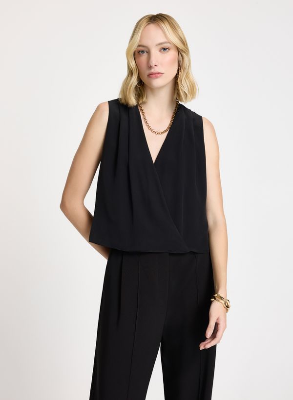 Confeccionada em seda, a Blusa possui decote em "V" profundo e transpassado, alças largas com pregas nos ombros, barra longtail arredondada e acabamento pespontado.