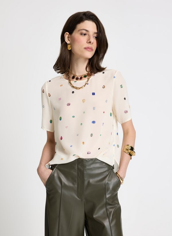 Confeccionada em seda, a Blusa possui modelagem reta, tipo camiseta com caimento leve e fluido, decote arredondado, mangas curtas, estampa localizada com elementos distribuídos por toda a peça, barra reta com costura fina e acabamento refinado.
