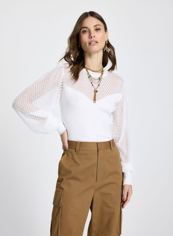 A Blusa é confeccionada em tricot canelado, possui recortes vazados com efeito rendado, caimento ajustado ao corpo, gola redonda, detalhe frontal com decote coração, mangas longas com volume bufante.
