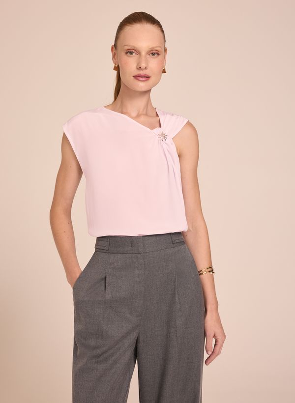 A Blusa é confeccionada em seda, possui decote assimétrico, sem mangas, detalhe de torção e acabamento pespontado.