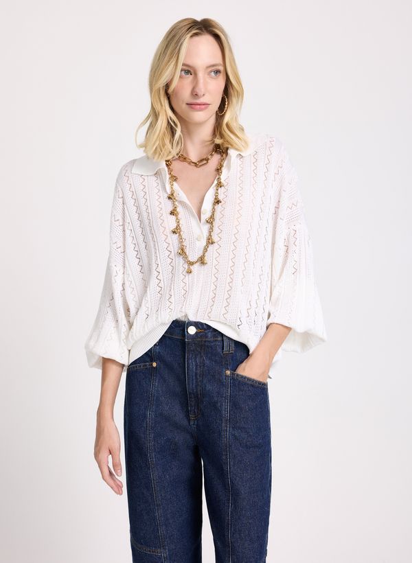 Confeccionada em tricot, a Blusa possui modelagem reta, caimento levemente ajustado ao corpo, gola polo estruturada, mangas longas com volume sutil, punhos ajustados, textura vazada em padronagem geométrica por toda a peça, fechamento frontal por botões e acabamento canelado na barra e nos punhos.