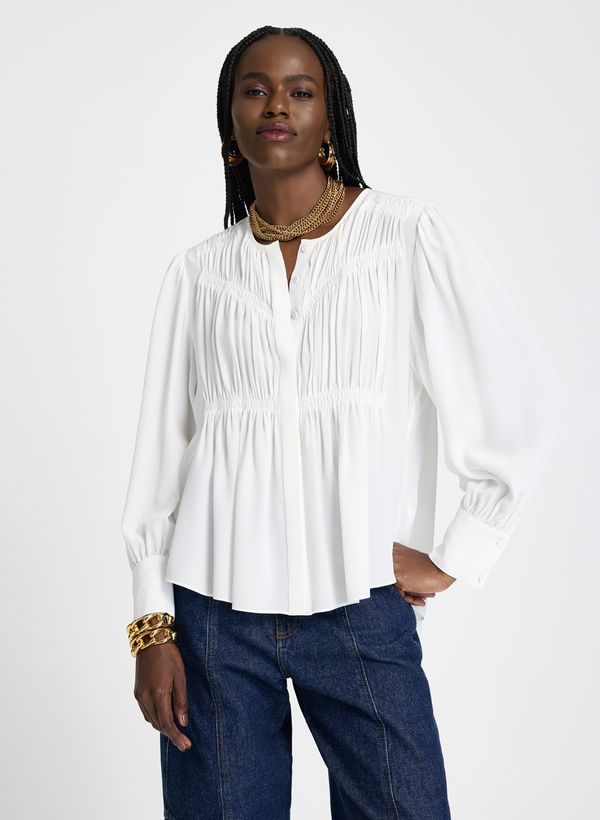 Confeccionada em seda, a Blusa possui modelagem reta com caimento mais fluido ao corpo, decote arredondado com acabamento delicado, textura plissada na parte frontal e posterior, mangas longas com punhos ajustados e acabamento refinado.