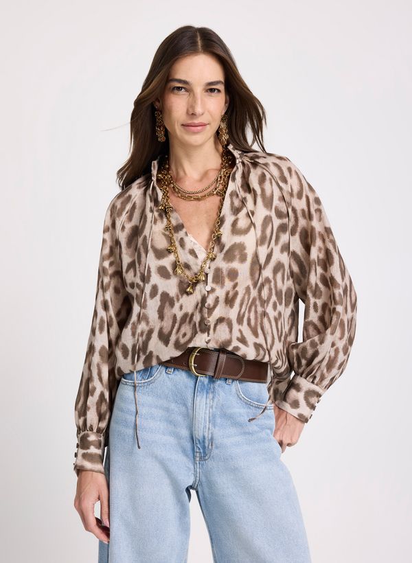 Confeccionada em algodão, a Blusa possui estampa animal print, gola alta com amarração frontal delicada, abertura de decote, mangas longas com leve volume, punhos largos, comprimento regular, fechamento frontal por botões forrados e acabamento refinado.