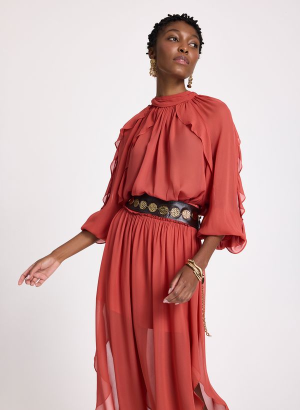 Confeccionada em tecido fluido, a Blusa possui modelagem solta, caimento leve, gola alta com acabamento delicado, pregas verticais na região frontal que criam movimento, mangas 3/4 amplas com transparência sutil, recortes com babados aplicados nos ombros e mangas, acabamento refinado nas barras e na gola.
