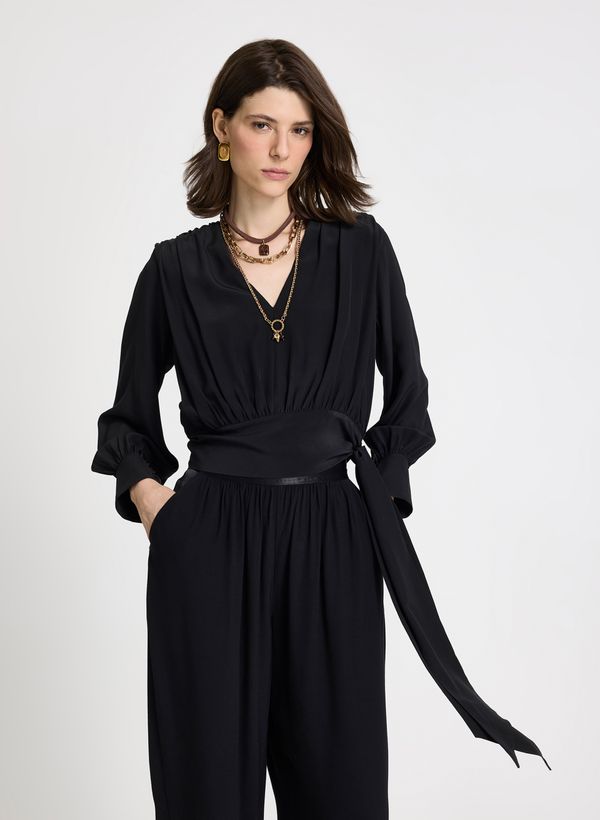 Confeccionada em seda, a Blusa possui decote em "V" transpassado, mangas longas com leve volume e punhos largos com abotoamento, cintura com elástico interno que valoriza o caimento, detalhe de faixa lateral alongada para amarração, acabamento delicado nas costuras e fechamento por transpasse com amarração.
