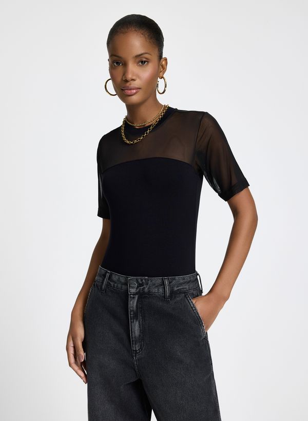 O Body é confeccionado em malha, possui recorte superior de tule, decote redondo, mangas curtas e fechamento inferior por colchetes de pressão.