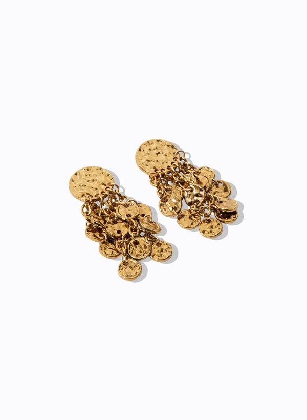 Produzido em metal, o Brinco possui base superior em formato circular com superfície texturizada, correntes articuladas em metal com acabamento polido, aplicação de múltiplos discos metálicos pendentes com efeito martelado, design alongado com movimento, estrutura encorpada, fechamento por pino com tarraxa e acabamento metálico brilhante.
