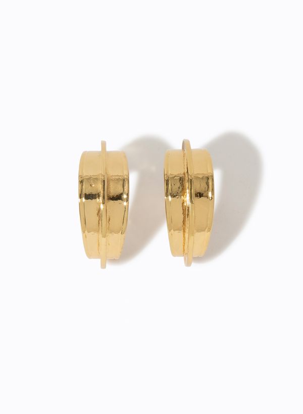 Produzido em metal, o Brinco possui modelagem argola média, formato curvo com design orgânico e sobreposição frontal, estrutura encorpada, pino posterior com fecho de encaixe e acabamento polido.