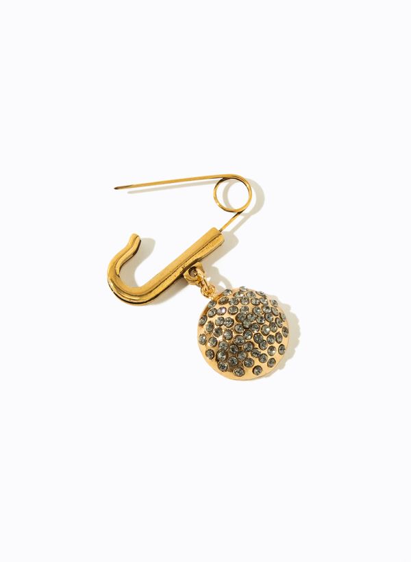 O Broche é produzido em metal com banho dourado, possui formato alfinete e argola com pingente arredondado e cristais Swarovski cravejados.