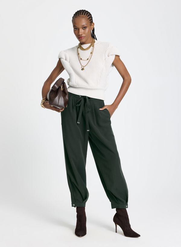 Confeccionada em tecido plano, a Calça possui modelagem reta, cintura alta com passantes aplicados e faixa para amarração, pregas frontais, bolsos frontais, pernas amplas com caimento solto, barra com abotoamento ajustável e acabamento pespontado.