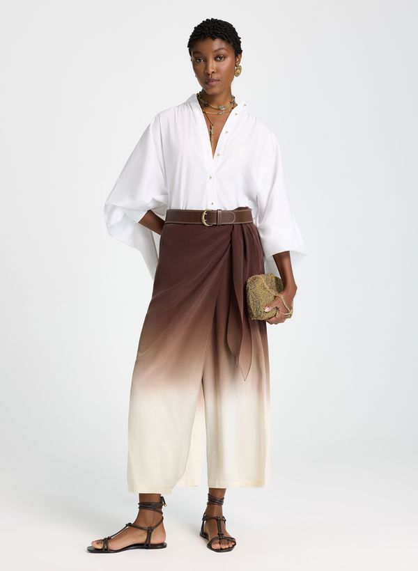 Confeccionado em seda, a Calça possui cintura alta, caimento amplo, pernas retas e longas, efeito degradê, faixa lateral aplicada que forma um detalhe de amarração na vista frontal, fenda frontal discreta criada pela sobreposição do tecido e acabamento limpo na barra.