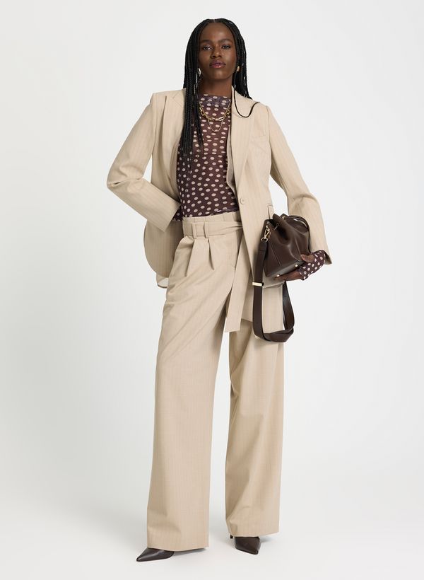 Confeccionada em tecido plano, a Calça possui modelagem e corte de alfaiataria, cintura alta com cós estruturado e passantes aplicados, faixa para amarração no mesmo tecido, pregas frontais, bolsos laterais, pernas amplas com caimento solto, comprimento longo e acabamento refinado.