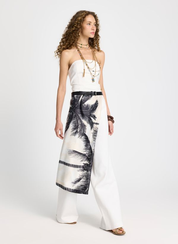 Confeccionada em linho e algodão, a Calça possui modelagem ampla de pernas retas, cintura alta, passantes aplicados no cós, bolsos posteriores quadrados, caimento fluido ao longo do corpo e acabamento de barra simples.