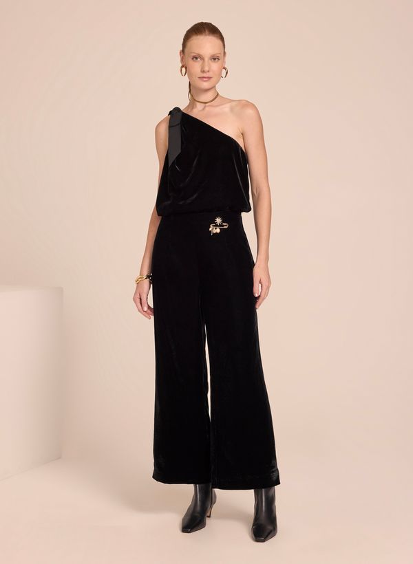 A Calça é confeccionada em tecido plano aveludado, possui caimento reto, cós alto e acabamento pespontado.