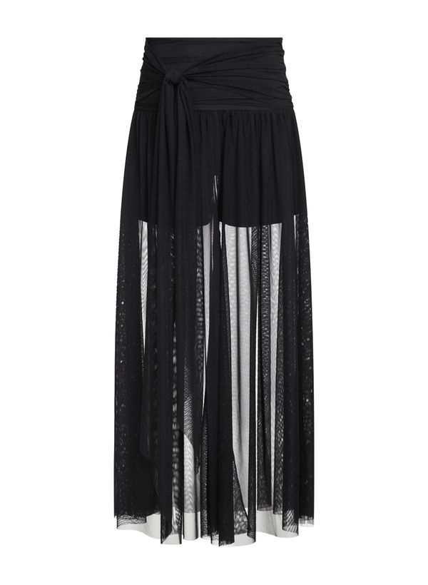 Confeccionada em tule, a Calça possui modelagem reta com caimento ajustado ao quadril e leve amplitude na barra, cintura alta com cós trabalhado em recortes horizontais, comprimento longo e acabamento em barra simples.