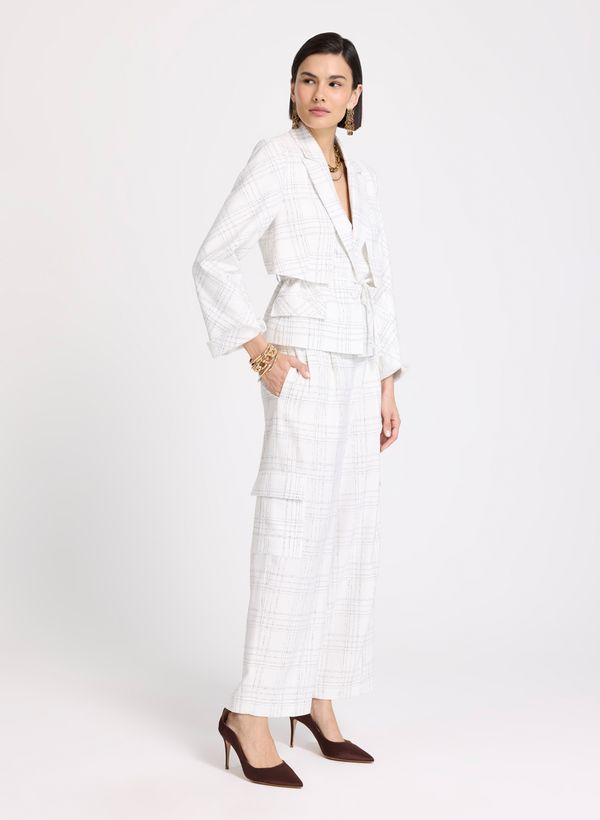 Confeccionada em tecido plano, a Calça possui modelagem reta com corte de alfaiataria, cintura alta e cós largo, faixa do próprio tecido para amarração frontal, estampa quadriculada, bolsos funcionais, recortes retos ao longo das pernas, comprimento longo, acabamento estruturado e fechamento frontal interno.