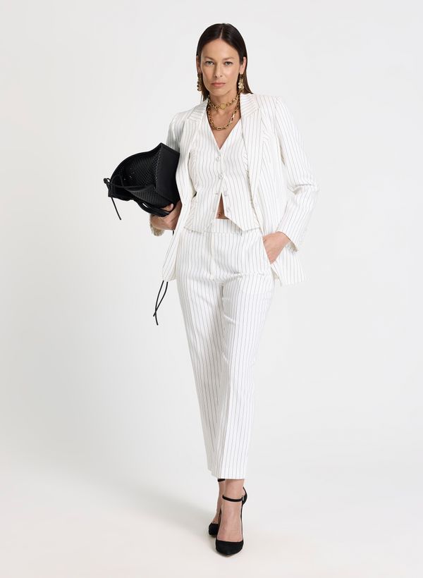 Confeccionada em tecido fluido, a Calça possui modelagem reta de comprimento longo, cintura alta com cós estruturado e passantes aplicados, padronagem listrada vertical que alonga a silhueta, recorte frontal discreto que contribui para o caimento alinhado, bolsos posteriores embutidos que mantêm o visual clean, fechamento frontal por zíper e colchete interno e acabamento refinado nas barras.