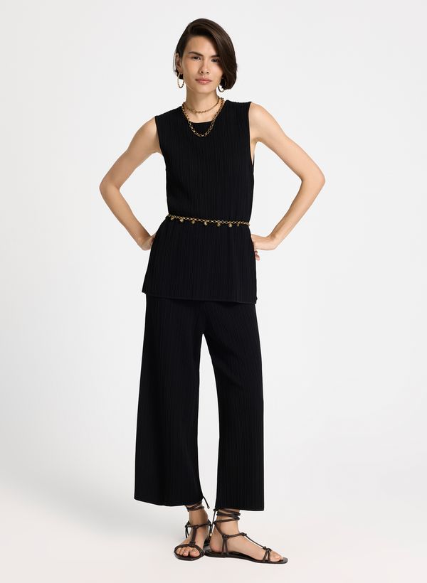 Confeccionada em malha, a Calça possui modelagem ampla, estilo pantalona, comprimento midi, cintura alta com cós largo em tecido canelado, caimento solto com textura em nervuras verticais e acabamento de barra simples.
