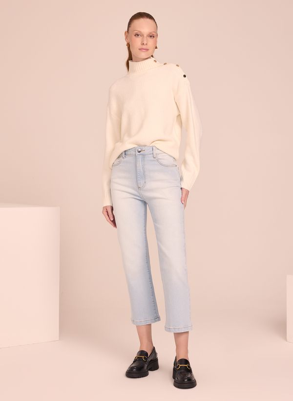 A Calça é confeccionada em jeans com lavagem clara, possui modelagem reta ao corpo, comprimento curto, cós com passantes, bolsos, fechamento frontal e acabamento pespontado,