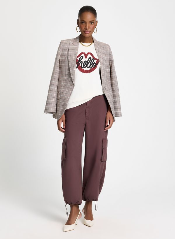 A Calça é confeccionada em sarja, possui modelagem balloon, cós aplicado, fechamento frontal por zíper e botão, seis bolsos, barra ajustável e acabamento pespontado.