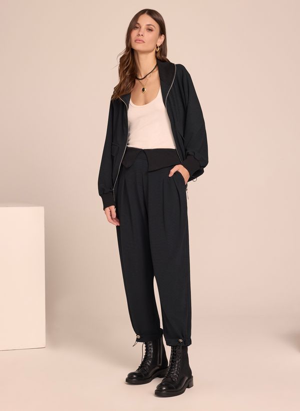 A Calça é confeccinada em malha texturizada, possui caimento reto, cós com recorte sobreposto e efeito canelado, pregas e bolsos frontais, elástico com regulador na barra e acabamento pespontado.