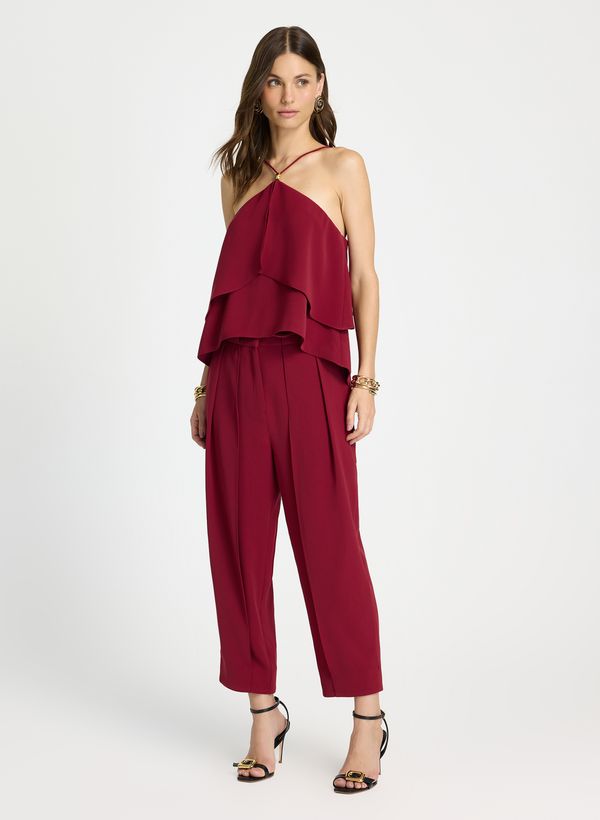 Em um tom sofisticado de vermelho rubi, a Calça Iara traduz elegância contemporânea com um toque easychic, perfeita para produções harmônicas e femininas. Combine com tops fluidos e sandálias de salto para um visual poderoso e moderno, ideal para ocasiões que pedem estilo e leveza.