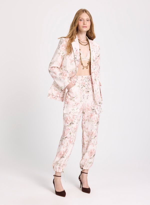 Confeccionada em tecido plano, a Calça possui modelagem e corte de alfaiataria, cintura média com cós estruturado, estampa floral, bolsos, barra afunilada com acabamento ajustado por elástico, fechamento frontal interno.