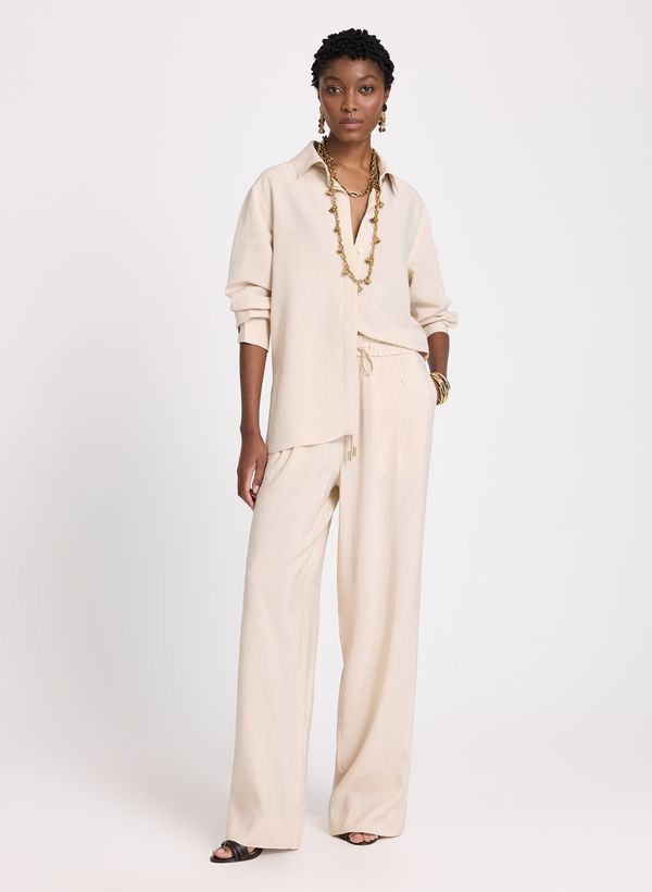 Confeccionada em tecido plano, a Calça possui modelagem wide leg com caimento reto ao longo das pernas, cintura alta com cós elástico embutido, cordão para amarração frontal com ponteiras metálicas, acabamento limpo na barra, fechamento por amarração no cós e costuras aparentes discretas.