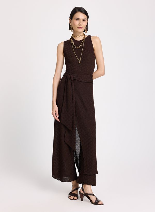 Confeccionada em tricot, a Calça possui modelagem reta com sobreposição frontal transpassada, cintura alta com cós largo e faixa para amarração lateral, textura encorpada com leve transparência no comprimento, acabamento inferior em renda delicada, comprimento longo e acabamento delicado sem fechamento aparente.