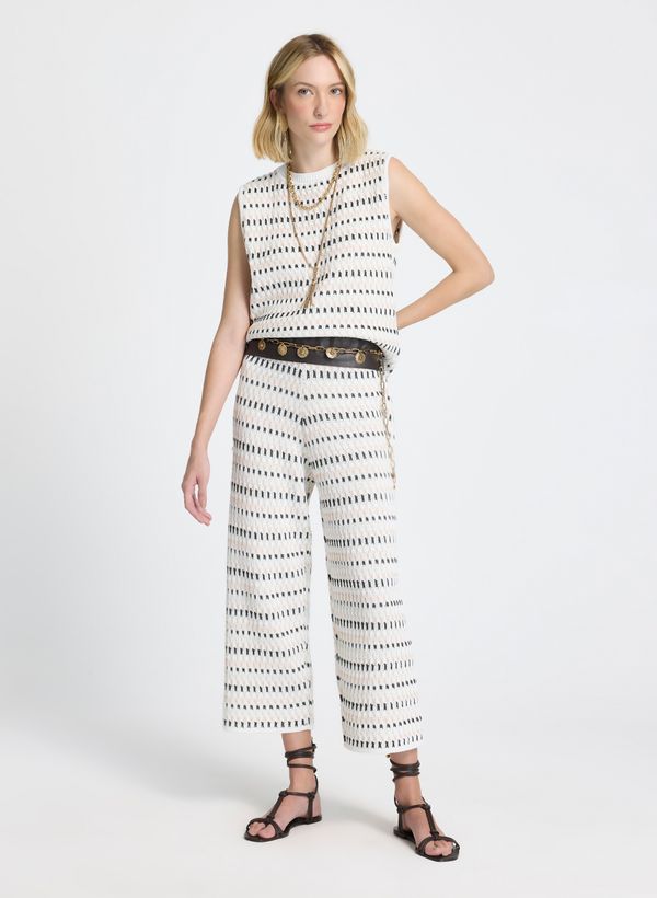 Confeccionada em tricot em alto-relevo bicolor, a Calça possui caimento reto, cós aplicado e acabamento canelado.