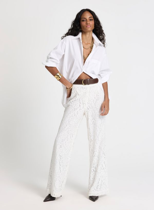 Confeccionada em tecido plano, a Calça possui textura rendada, modelagem reta ao corpo, cintura alta com cós largo estruturado, forro interno curto para maior conforto e acabamento delicado na barra.