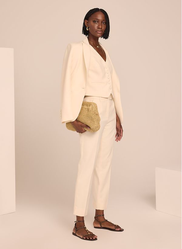 A Calça é confeccionada em tecido plano, possui modelagem de alfaiataria, cós com passantes, fechamento frontal por zíper, quatro bolsos, mini fenda nas laterais e acabamento pespontado.