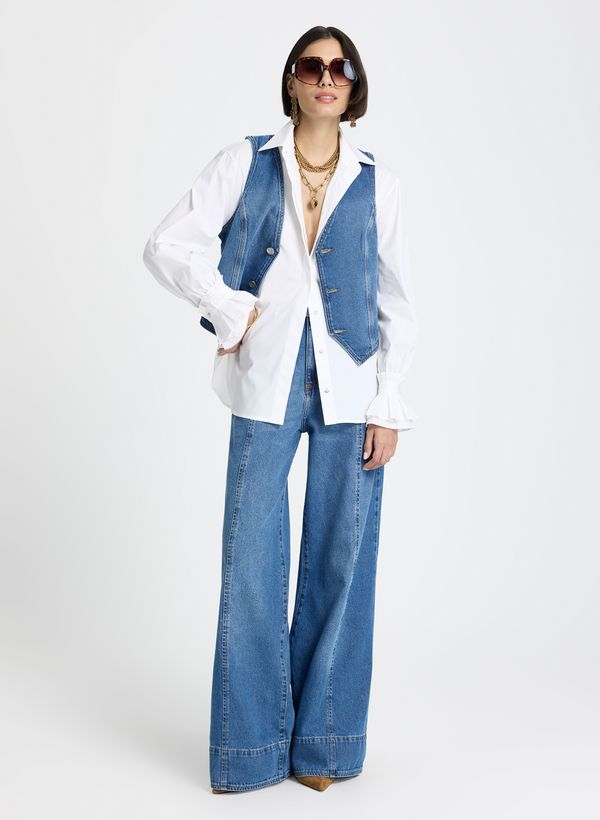 Confeccionada em jeans, a Calça possui modelagem pantalona com shape wide leg, cintura alta com cós estruturado e passantes aplicados, bolsos frontais e posteriores funcionais, barra ampla com acabamento dobrado e fechamento frontal por zíper e botão.