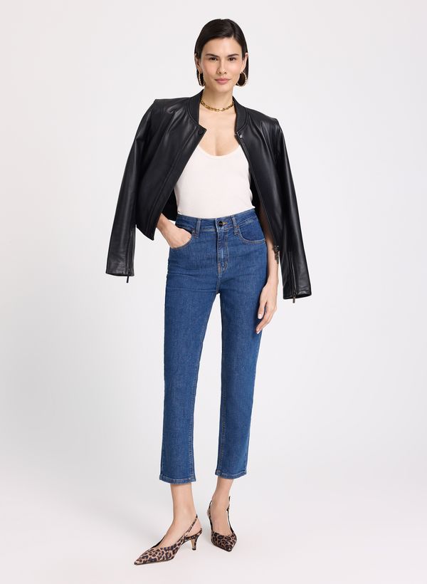 Confeccionada em jeans com lavagem média, a Calça possui modelagem capri, cós com passantes, cinco bolsos, fechamento frontal por zíper e botão e acabamento pespontado.