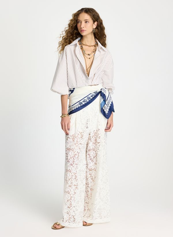 Confeccionada em tecido plano rendado, a Calça possui modelagem pantalona, cintura alta com cós largo estruturado, corpo em renda floral com transparência localizada e forro interno curto, comprimento longo com barra rendada e fechamento posterior por zíper invisível.