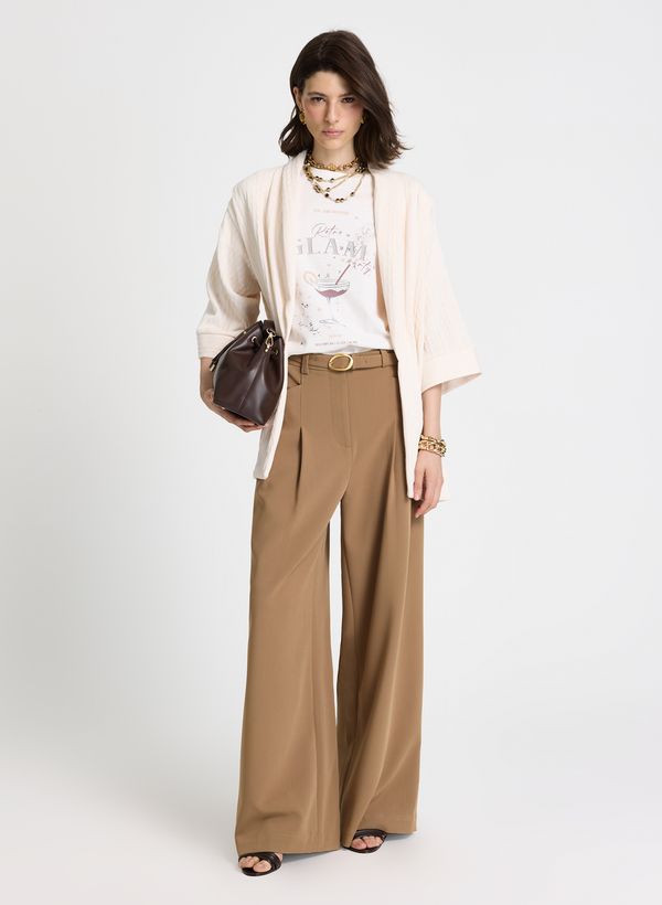 Confeccionada em tecido plano com leve elasticidade, a Calça possui modelagem pantalona de comprimento longo, cintura alta com cós estruturado e passantes aplicados, pregas frontais que valorizam o caimento, bolsos frontais funcionais embutidos e bolsos posteriores decorativos, acompanha cinto do mesmo tecido com fivela metálica oval, fechamento frontal por zíper interno e colchete e barra ampla com acabamento limpo.
