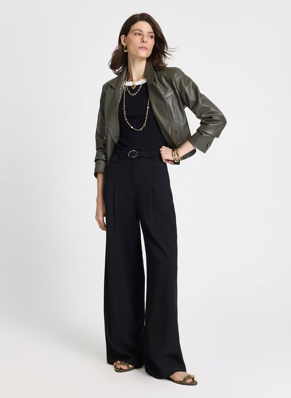 Confeccionada em tecido plano com leve elasticidade, a Calça possui modelagem pantalona de comprimento longo, cintura alta com cós estruturado e passantes aplicados, pregas frontais que valorizam o caimento e proporcionam fluidez ao movimento, bolsos frontais funcionais embutidos e bolsos posteriores decorativos. Acompanha cinto do mesmo tecido com fivela metálica oval.