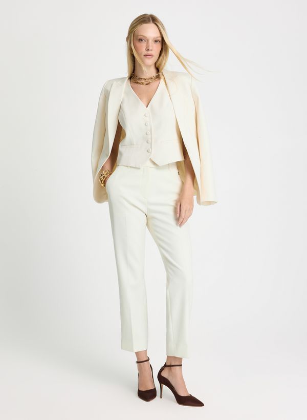 Confeccionada em tecido plano, a Calça possui modelagem e corte de alfaiataria, modelo skinny, cós com passantes, fechamento frontal com botão e zíper, detalhe de vinco e acabamento pespontado.
