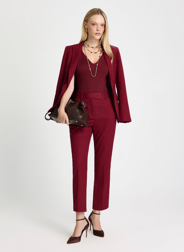 Confeccionada em tecido plano de toque macio, a Calça possui modelagem skinny, comprimento cropped, cintura alta com cós estruturado e passantes aplicados, recortes frontais que alongam a silhueta, bolsos frontais funcionais embutidos e bolsos posteriores decorativos, fechamento frontal por zíper interno e colchete, além de barra reta com acabamento limpo, garantindo conforto, caimento impecável e sofisticação ao vestir.