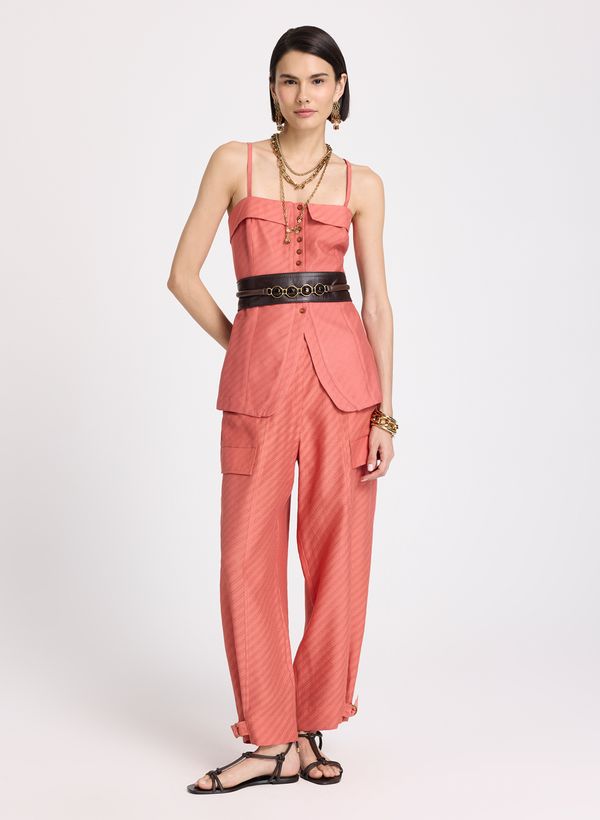 Confeccionada em tecido plano, a Calça possui modelagem reta com cintura alta, cós estruturado, pregas frontais que valorizam o caimento, bolsos funcionais, barra ajustável com tiras e argolas metálicas, acabamento pespontado e fechamento frontal por zíper e colchete.