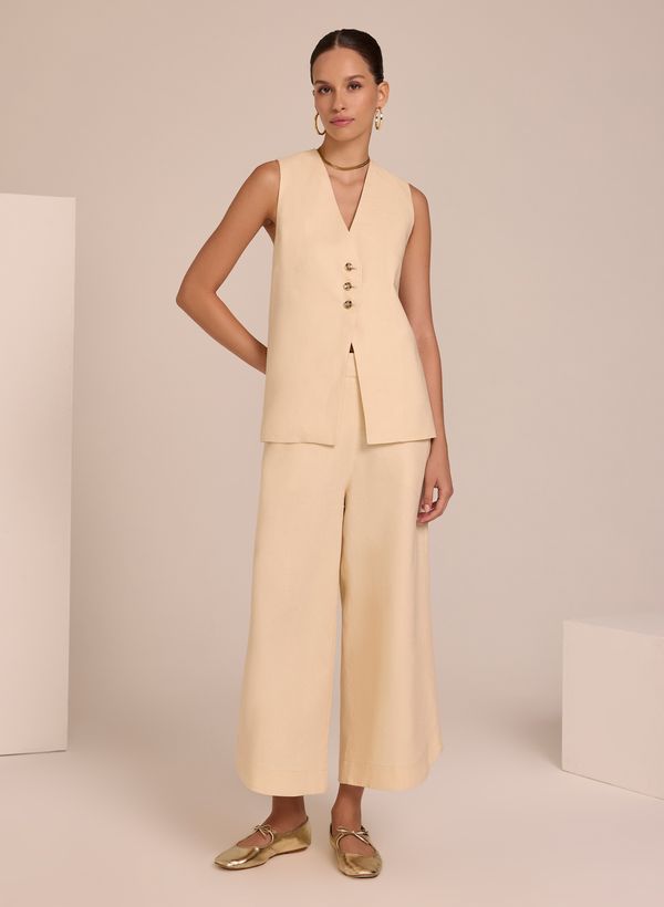 A Calça é confeccionada em linho, possui modelagem de alfaiataria, modelo pantacourt, cós com passantes, cordão e lastex posterior, fechamento na lateral por zíper, quatro bolsos, barra arredonda e acabamento pespontado.